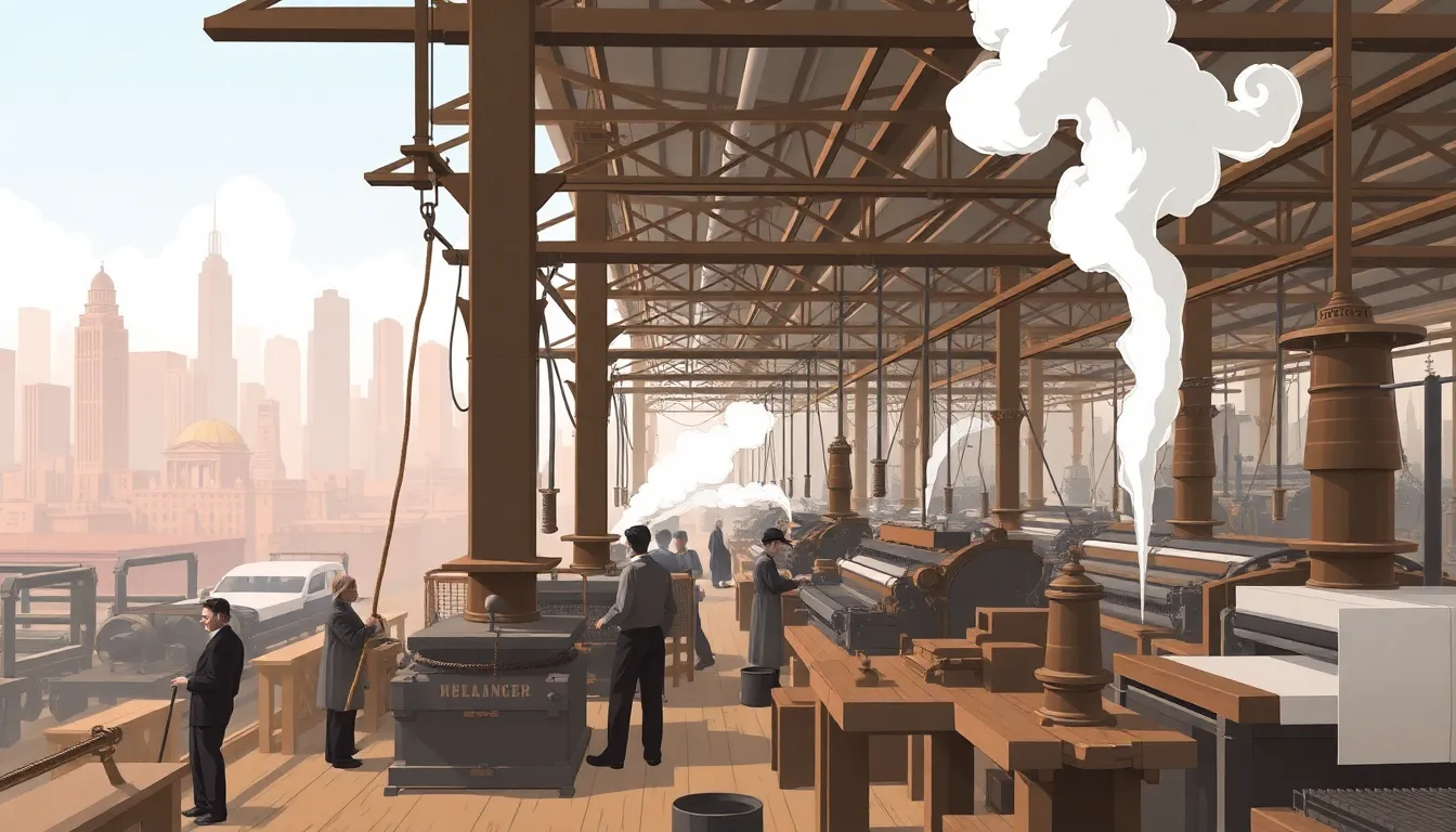 The Industrial Revolution, starting in the late 18th century, introduced machinery that revolutionized production processes. Factories emerged, utilizing steam power to increase efficiency and output. Significant innovations included the spinning jenny and the power loom, which enhanced textile manufacturing. Workers transitioned from agrarian lifestyles to factory jobs, fundamentally altering social structures. Urbanization surged as people flocked to cities for employment opportunities. This period laid the groundwork for mass production and modern economies, significantly impacting living standards and global trade.